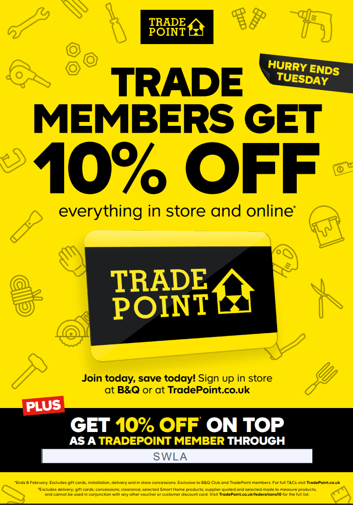 10% Off Everything at B&Q/TradePoint This Weekend – SWLA TradePoint Members Receive an Extra 10% Off